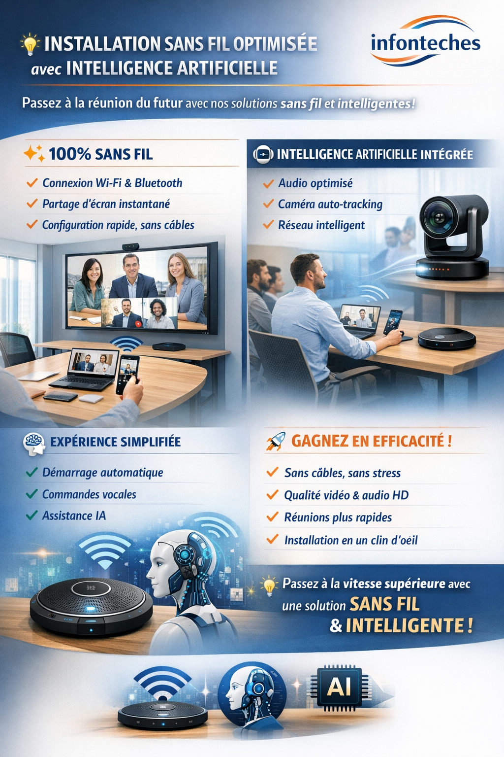 Avec Infonteches, passez à la réunion du futur grâce à des solutions sans fil intelligentes intégrant l'IA. Fini les câbles encombrants, les branchements complexes et les pertes de temps avant vos réunions. Nous vous proposons une expérience fluide, intuitive et hautement performante.
