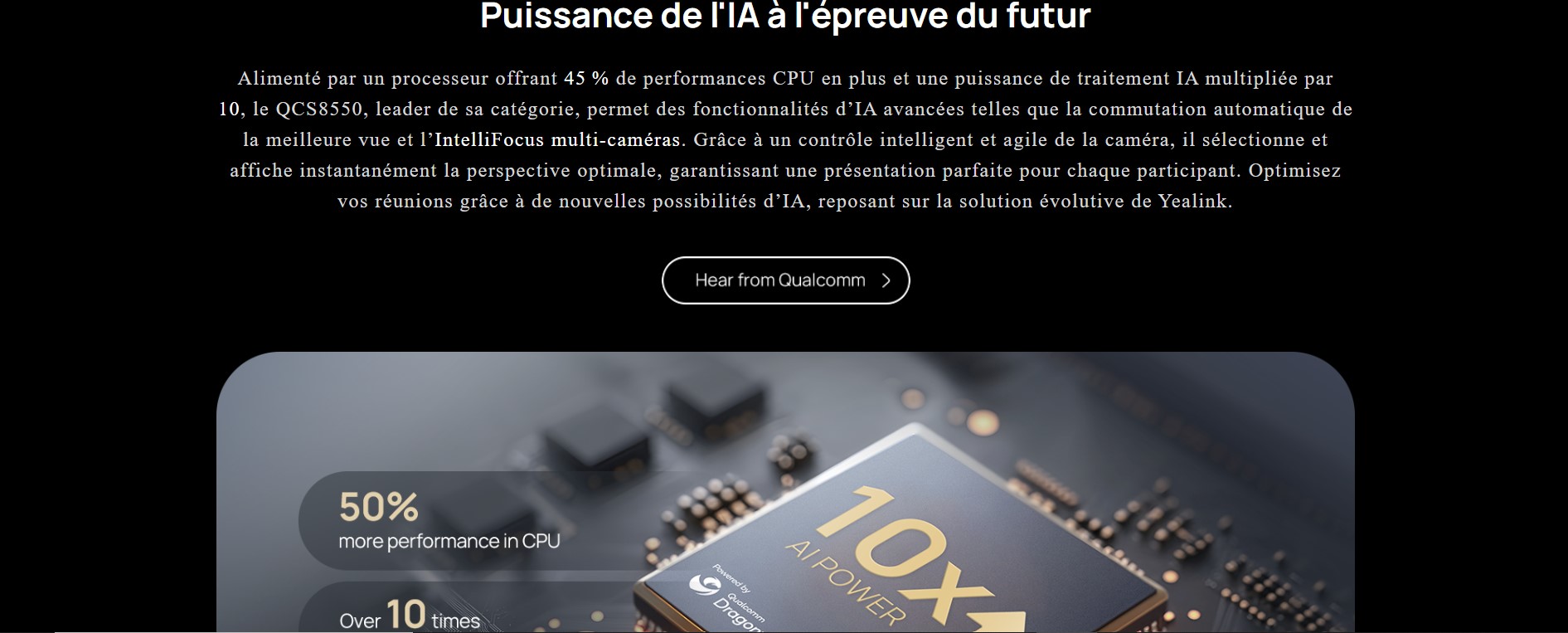 L'IA analyse en temps réel le son ambiant pour réduire les bruits de fond, amplifier les voix et assurer une qualité vocale cristalline.