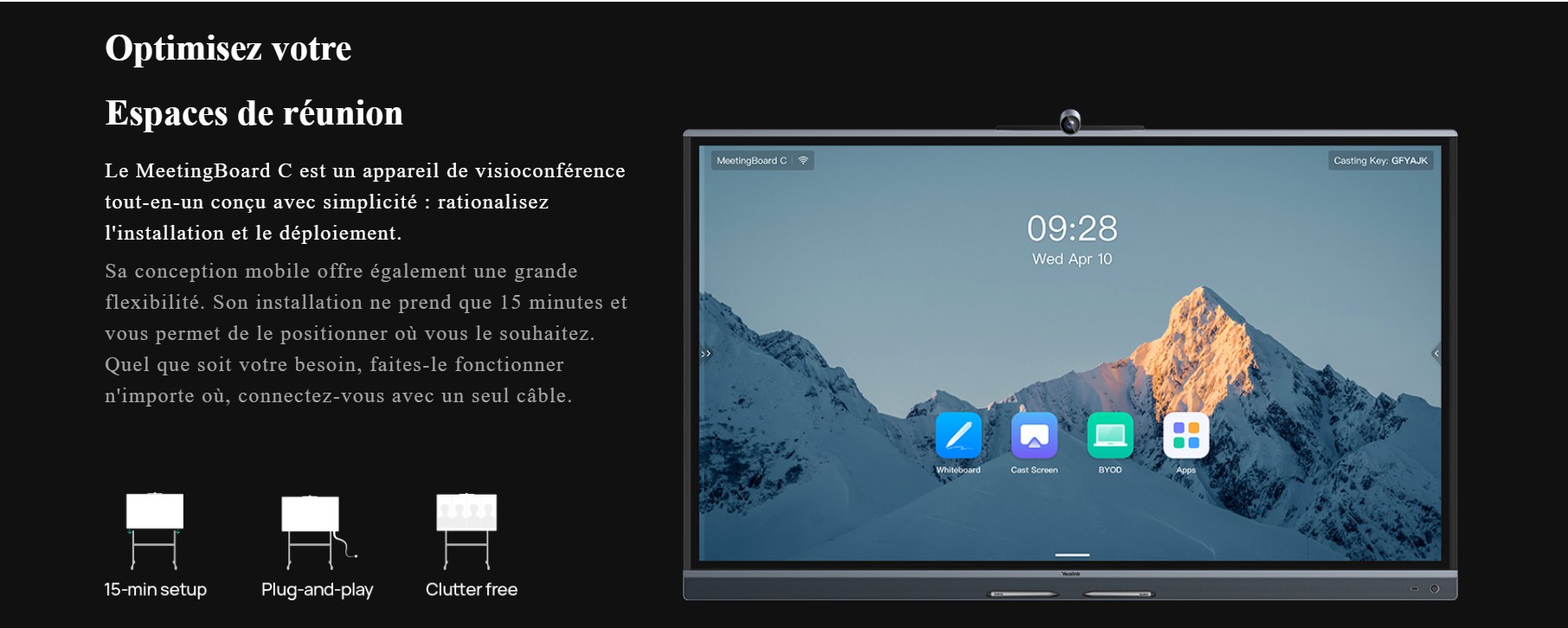 Cette solution tout-en-un regroupe écran interactif, caméra, micros et haut-parleurs : aucune installation complexe ni configuration longue n'est nécessaire, il suffit simplement de brancher le câble d'alimentation.