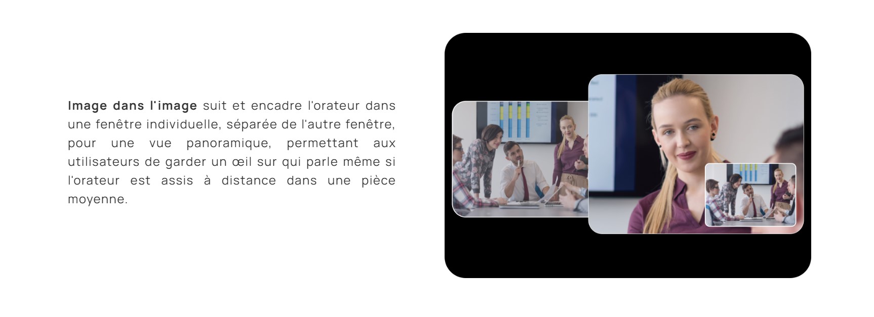 Aussi, cette seconde optique peut être utilisée pour réaliser des visioconférences en Picture in Picture (PiP). Ainsi, une vignette affiche l'ensemble de la salle et l'image principale se focalise sur l'orateur.