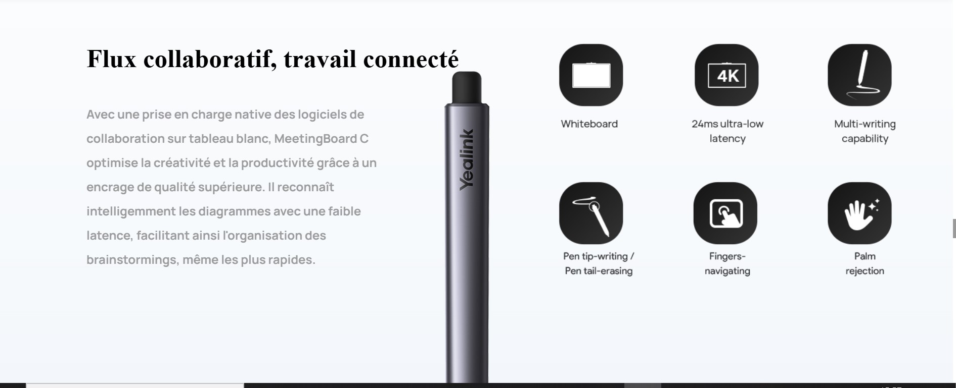 Conçu pour stimuler la productivité, le MB intègre un tableau blanc intelligent pour les séances de brainstorming. Les utilisateurs peuvent y tracer des formes intelligentes, insérer des images / tableaux, ajouter des post-it et annoter librement. Les deux stylets fournis permettent d'écrire à tour de rôle ou simultanément, avec un toucher fluide et une latence minimale, pour une expérience d'écriture naturelle.