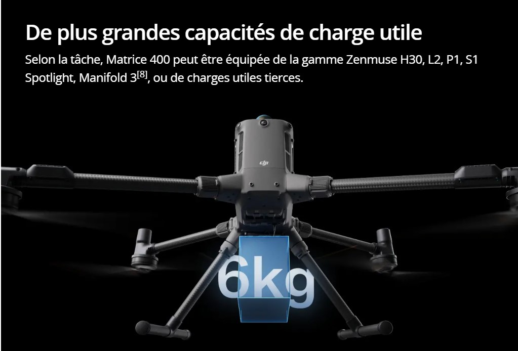 DJI Matrice 400, la plateforme de drones phare de DJI Enterprise, offre un temps de vol impressionnant de 59 minutes[1], une capacité de charge utile allant jusqu'à 6 kg[2], ainsi qu'un LiDAR rotatif et un radar intégrés pour la détection d'obstacles au niveau des lignes électriques[3]. Elle prend également en charge le système de transmission vidéo amélioré O4 Enterprise ainsi que la transmission vidéo par relais aéroporté[4], garantissant une manipulation plus sûre et une utilisation simplifiée. Combinant la détection intelligente avec l'imagerie visible et thermique, la projection AR, le décollage et l'atterrissage à partir d'un navire et l'automatisation avancée, Matrice 400 excelle dans les interventions d'urgence, les inspections énergétiques, la cartographie et l'AEC.