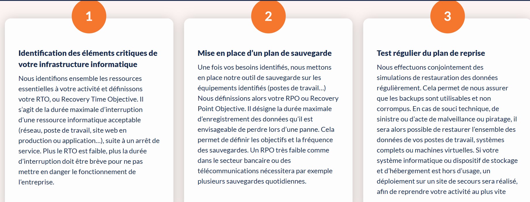 PCA / PRA : scénarios (ransomware, panne, erreur humaine), RTO/RPO, procédures de bascule et checklists.